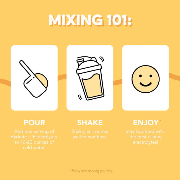 HOW TO USE: Add Hydrate packet to 12-16 oz. of water. Mix well and consume during your workout or anytime throughout the day to boost hydration levels.